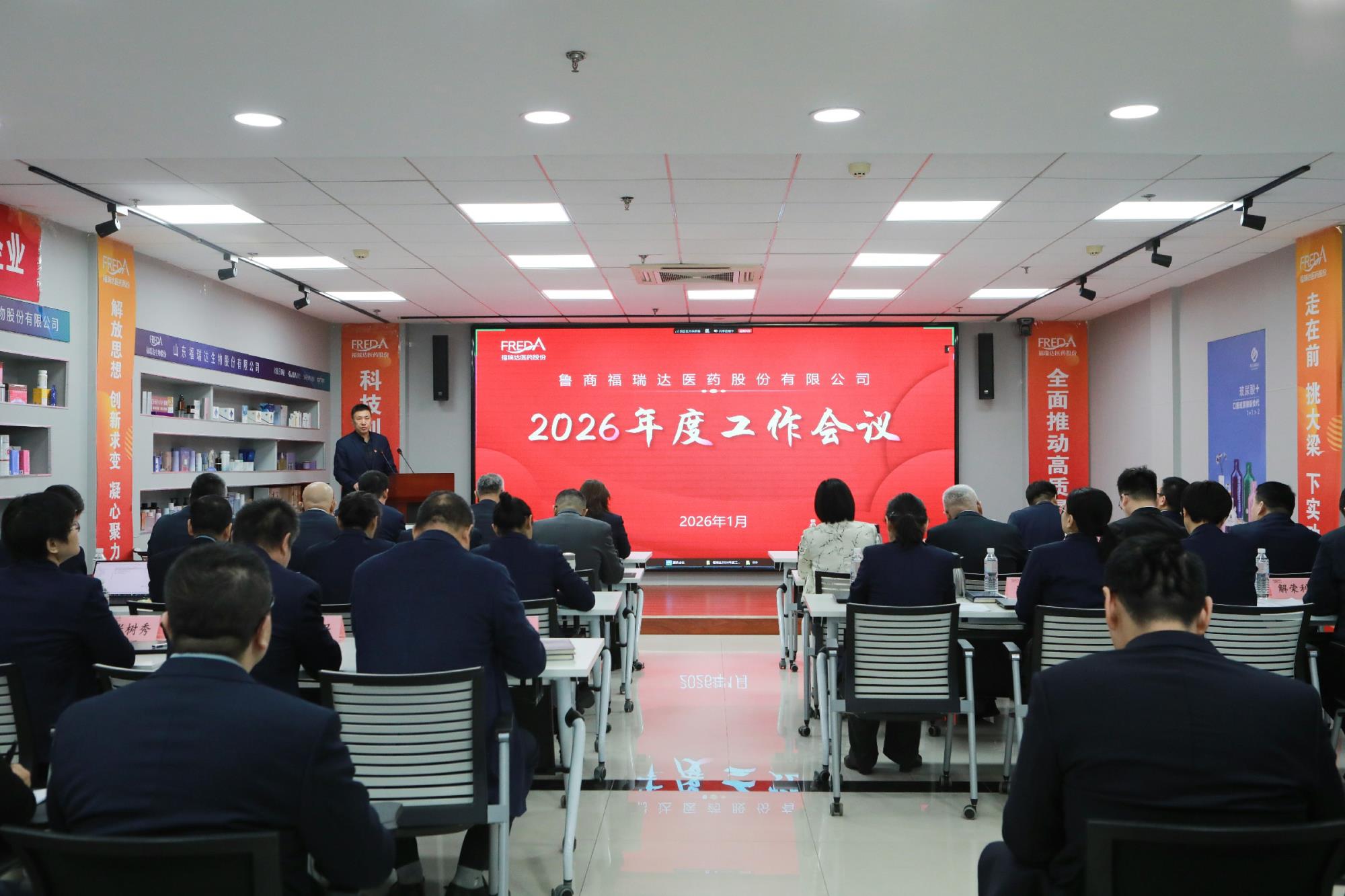 1月12日,福瑞达医药股份召开2026年度工作会议,深入学习贯彻鲁商集团2026年度工作会议精神,全面总结2025年经营工作,系统部署2026年目标任务,动员全体干部职工凝心聚力、创新提质,奋力开创公司高质量发展新局面。鲁商集团党委常委、副总经理、工会主席贾庆文到会指导并作点评讲话。鲁商集团总经理助理、福瑞达党委书记张岱州出席会议并讲话。福瑞达党委副书记、董事周明主持会议。