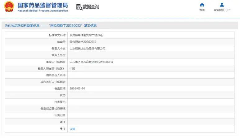 国货护肤科技再攀巅峰!福瑞达生物股份旗下深耕皮肤微生态领域的瑷尔博士品牌近日传来重磅捷报——新原料「表皮葡萄球菌发酵产物滤液」成功完成备案,备案号为“国妆原备字20260032”。这是国内首个皮肤来源的益生菌类原料,一举填补国内行业空白,标志着瑷尔博士在皮肤微生态研发领域实现关键性突破,为中国微生态护肤产业的原料创新与技术升级注入强劲动能。