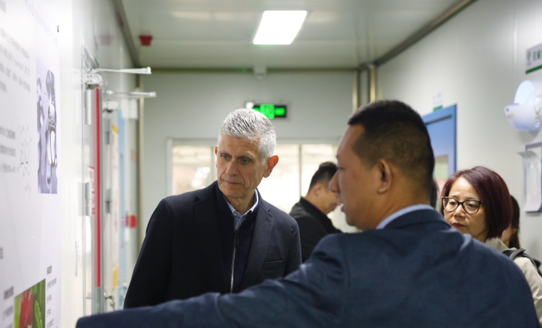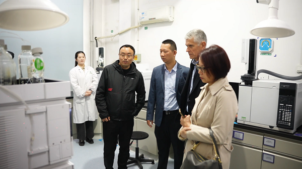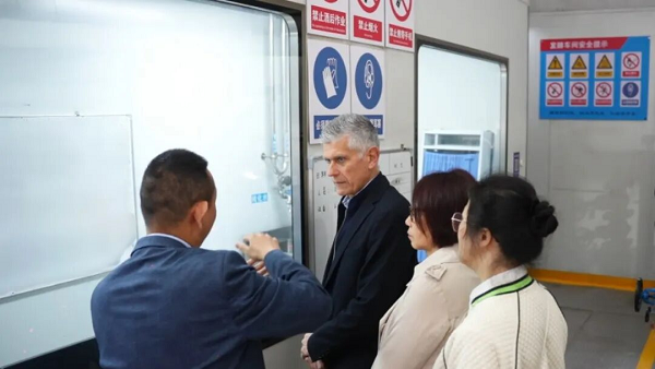 Marco Guerrini教授一行先后参观了焦点福瑞达的透明质酸钠生产基地、研发中心及企业展厅。在生产基地,专家们深入发酵、纯化等车间,实地考察透明质酸钠的全流程生产工艺,对焦点福瑞达在微生物发酵、多糖结构修饰及质量控制等领域的产业化能力给予高度评价。在研发中心,各位专家重点了解了技术创新体系布局、核心技术攻关方向及前沿仪器平台建设等情况。在企业展厅,通过丰富的图文资料与产品展示,系统掌握了焦点福瑞达的发展历程、核心技术体系与全球市场布局。